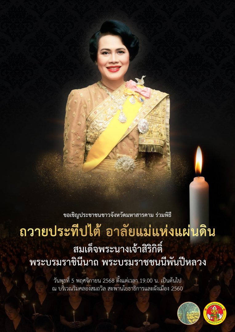เทศบาลเมืองมหาสารคาม ร่วมกับจังหวัดมหาสารคาม ขอเชิญชวนร่วมพิธีถวายประทีปไต้ อาลัยแม่แห่งแผ่นดิน
