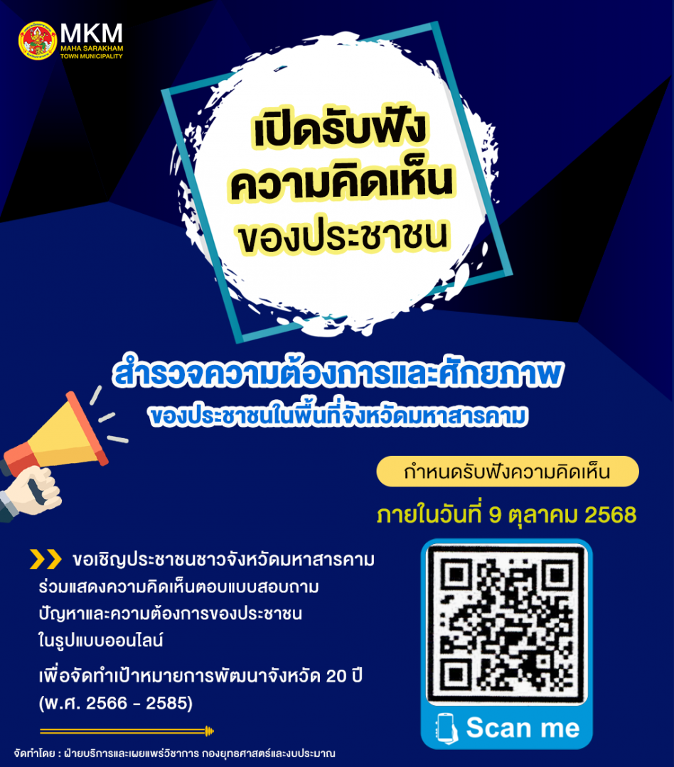 ขอเชิญประชาชนชาวจังหวัดมหาสารคาม ร่วมแสดงความคิดเห็นตอบแบบสอบถามปัญหาและความต้องการของประชาชนในรูปแบบออนไลน์ เพื่อจัดทำเป้าหมายการพัฒนาจังหวัด 20 ปี (พ.ศ.2566 – 2585) ภายในวันที่ 9 ตุลาคม 2568