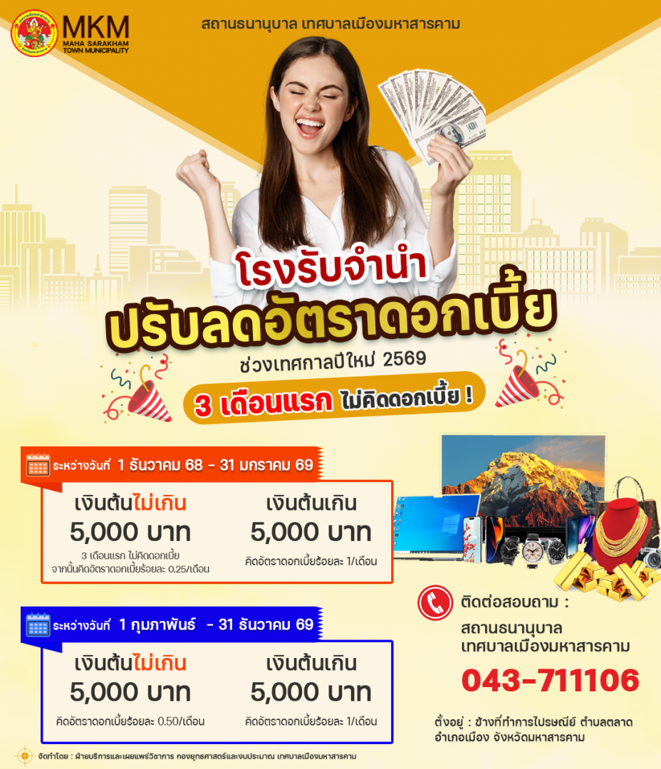 ข่าวประชาสัมพันธ์, ประชาสัมพันธ์-หน้าแรกของขวัญปีใหม่ 2569 จากสถานธนานุบาล (โรงรับจำนำ) เทศบาลเมืองมหาสารคาม 🎉ปรับลดอัตราดอกเบี้ย ช่วยแบ่งเบาภาระประชาชน Leave a Comment / ข่าวประชาสัมพันธ์, ประชาสัมพันธ์-หน้าแรก / admin02 🎉ของขวัญปีใหม่ 2569